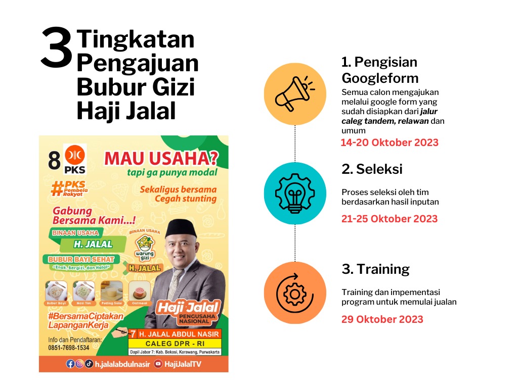 Haji Jalal Abdul Nasir telah mengambil inisiatif untuk menyediakan sumber daya yang diperlukan untuk menjual bubur bayi sehat, termasuk persediaan untuk seminggu, peralatan penjualan, dan brosur, semuanya disediakan secara gratis. Bagi yang berminat untuk menjadi mitra dalam inisiatif ini, terdapat Google Form yang dapat diisi untuk mengajukan aplikasi.