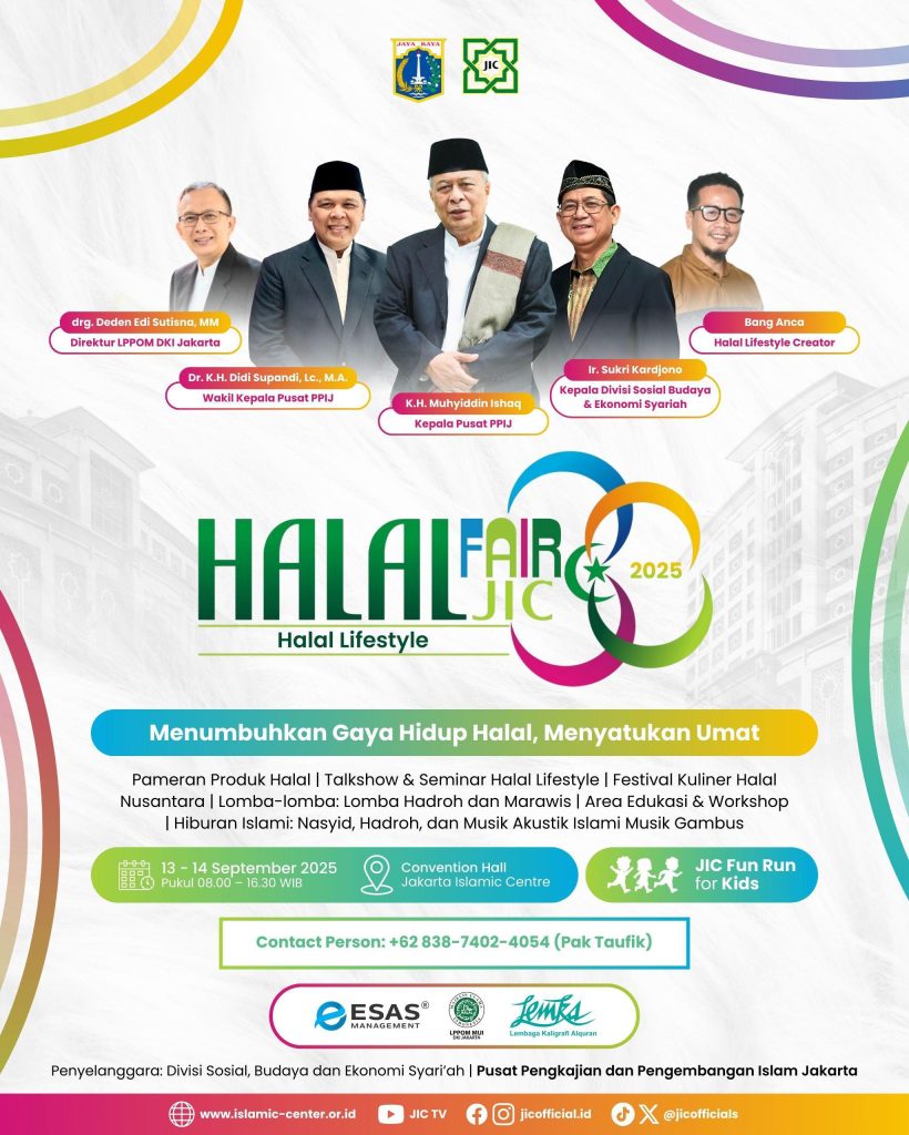 Jakarta, Mediaislam.id–Jakarta Islamic Centre (JIC) akan menggelar Halal Fair 2025 pada 13–14 September 2025 di Convention Hall JIC, Jakarta Utara. Kegiatan ini mengusung tema “Halal Lifestyle – Menumbuhkan Gaya Hidup Halal, Menyatukan Umat.”