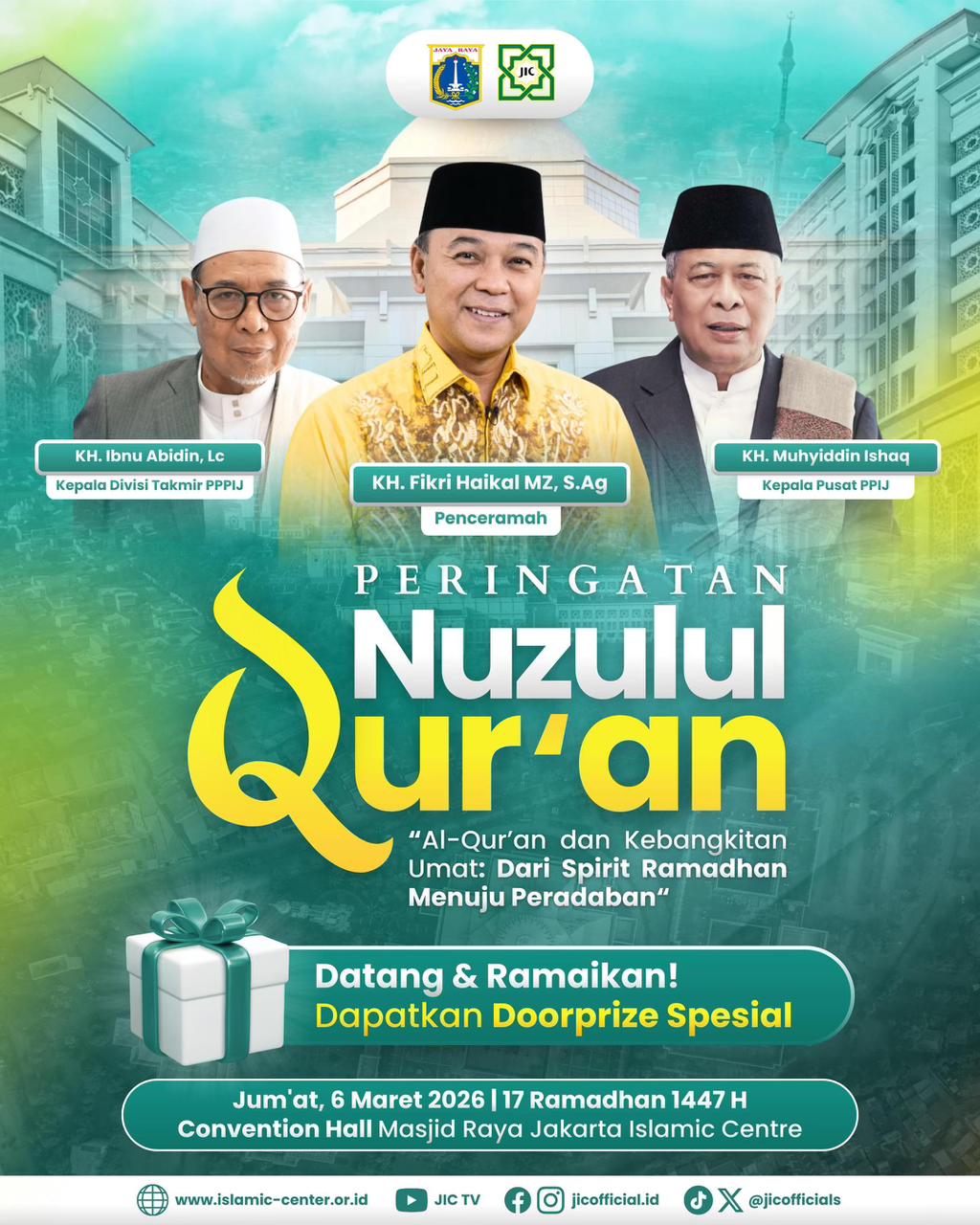 Jakarta (Mediaislam.id)–Masjid Raya Jakarta Islamic Centre (JIC) menggelar peringatan Nuzulul Qur’an 1447 H pada Jumat, 6 Maret 2026, bertepatan dengan 17 Ramadhan 1447 H. Acara bertema “Al-Qur’an dan Kebangkitan Umat: Dari Spirit Ramadhan Menuju Peradaban” ini digelar untuk memperkuat kecintaan umat terhadap Al-Qur’an dan membumikan nilai-nilainya dalam kehidupan sehari-hari.