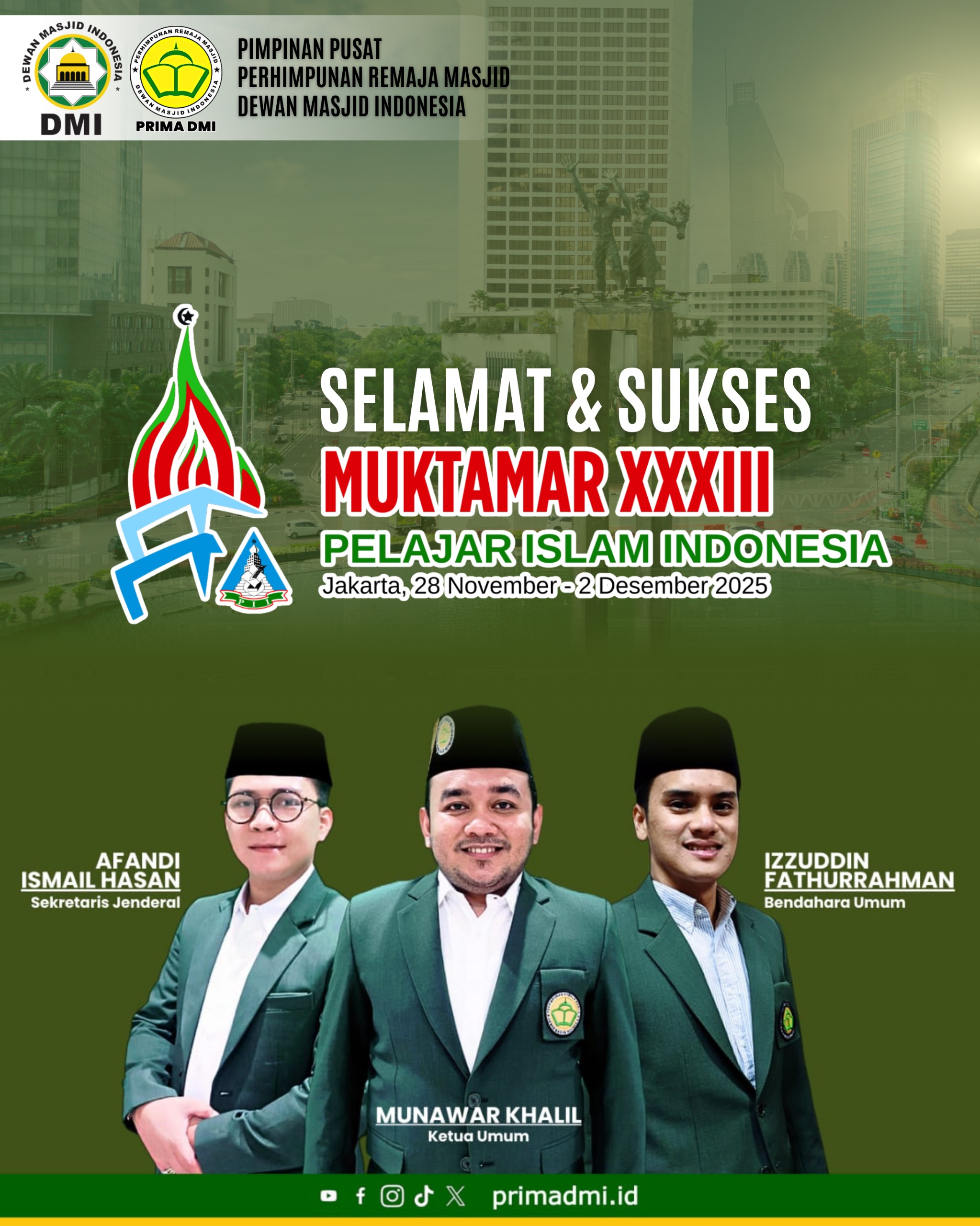 Jakarta, Mediaislam.id–Ketua Umum Pimpinan Pusat Perhimpunan Remaja Masjid Dewan Masjid Indonesia (PP PRIMA DMI), Munawar Khalil, meluruskan informasi yang beredar terkait beredarnya sebuah flyer yang menampilkan dukungan terhadap pelaksanaan Muktamar XXXIII Pelajar Islam Indonesia (PII) di Jakarta, 28 November-2 Desember 2025.