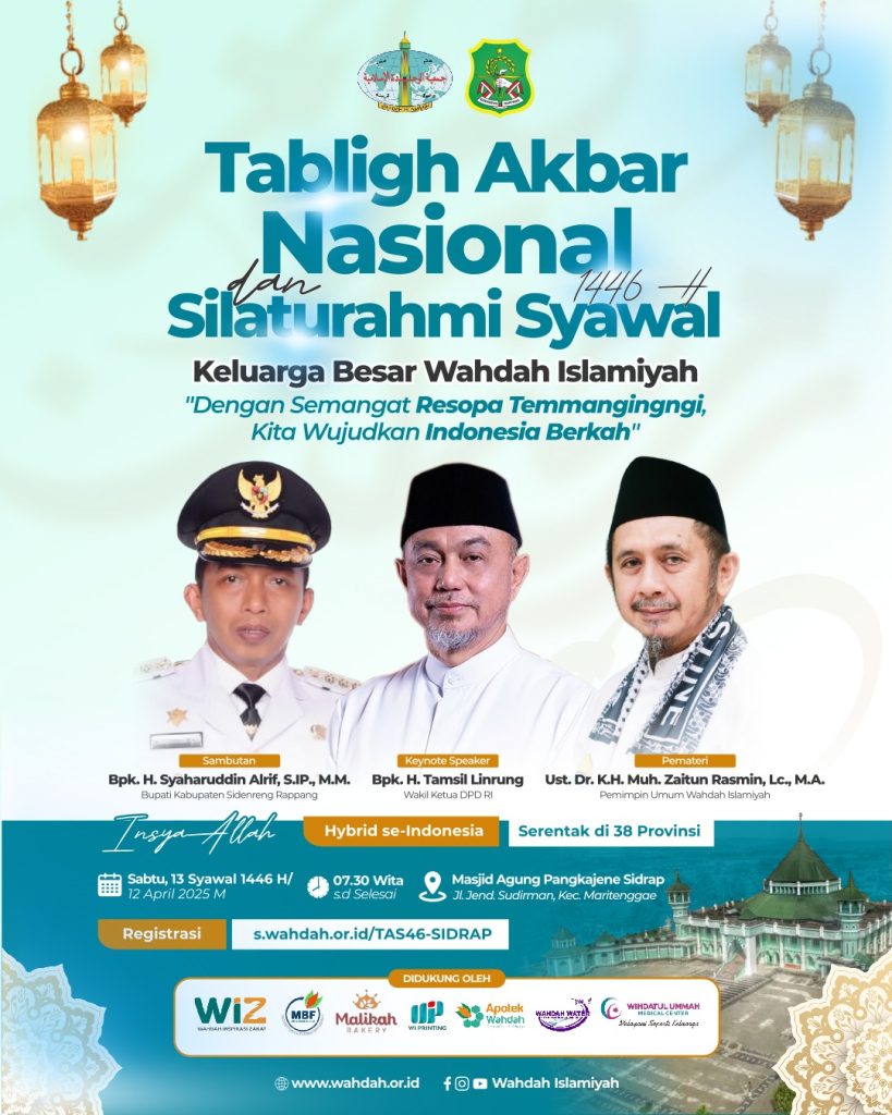 Sidrap, Mediaislam.id–Kabupaten Sidrap, Sulawesi Selatan, yang dikenal sebagai penghasil beras terbesar di provinsi ini, akan menjadi tuan rumah bagi Tabligh Akbar dan Silaturahim Nasional (Silatnas) Wahdah Islamiyah pada 12 April 2025. Kegiatan ini akan dilaksanakan di lokasi Masjid Agung Sidrap secara hibrid, menggabungkan pertemuan offline dan online, dengan sekitar 5.000 kader yang akan hadir secara langsung, sementara ribuan peserta lainnya akan mengikuti acara ini melalui platform daring. Tampil memberikan materi Tabligh Akbar oleh Pimpinan Umum Wahdah Islamiyah DR. KH. Muhammad Zaitun Rasmin,Lc.,MA.